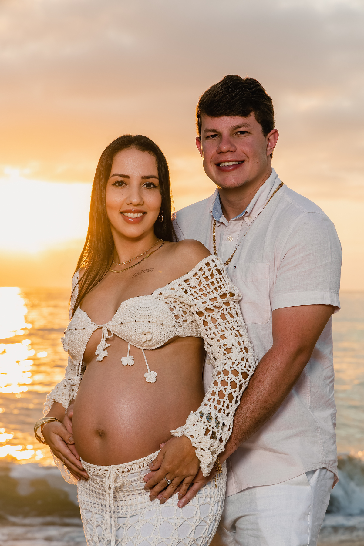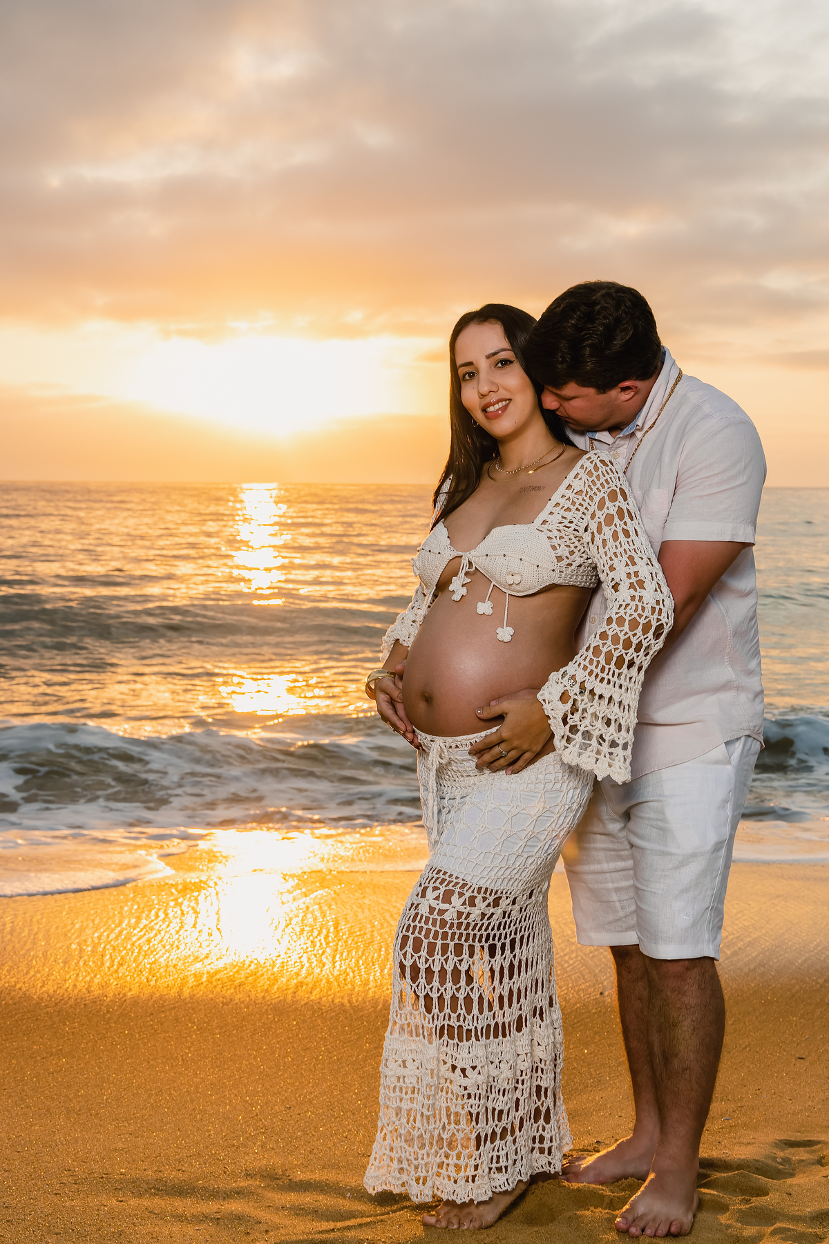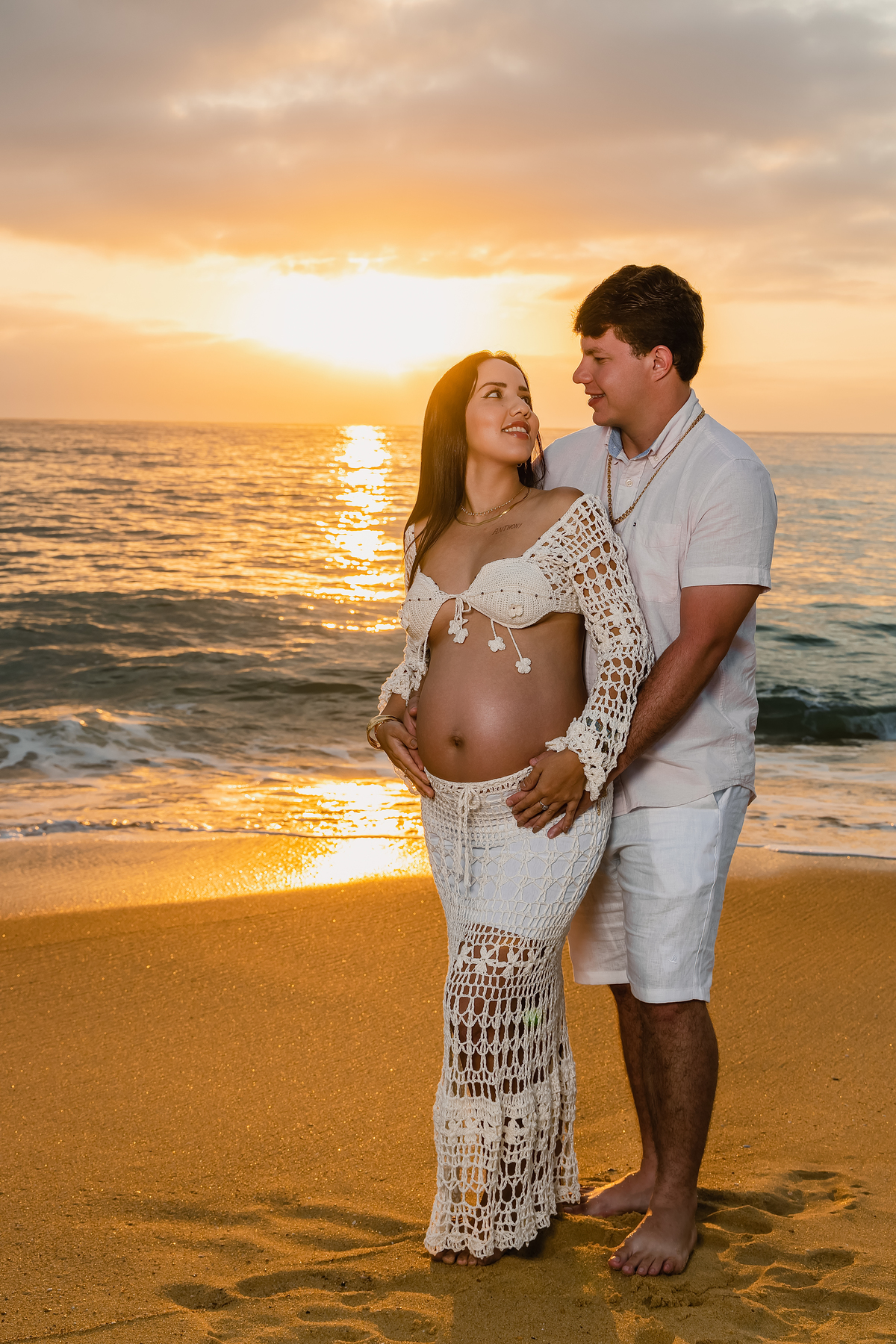 A praia, com sua imensidão azul e a luz dourada do amanhecer, foi o palco ideal para registrar esse amor que transborda. Cada passo na areia carregava significado. Cada abraço revelava cumplicidade. Cada sorriso deixava claro que a chegada de Antonella já transformou tudo ao redor.