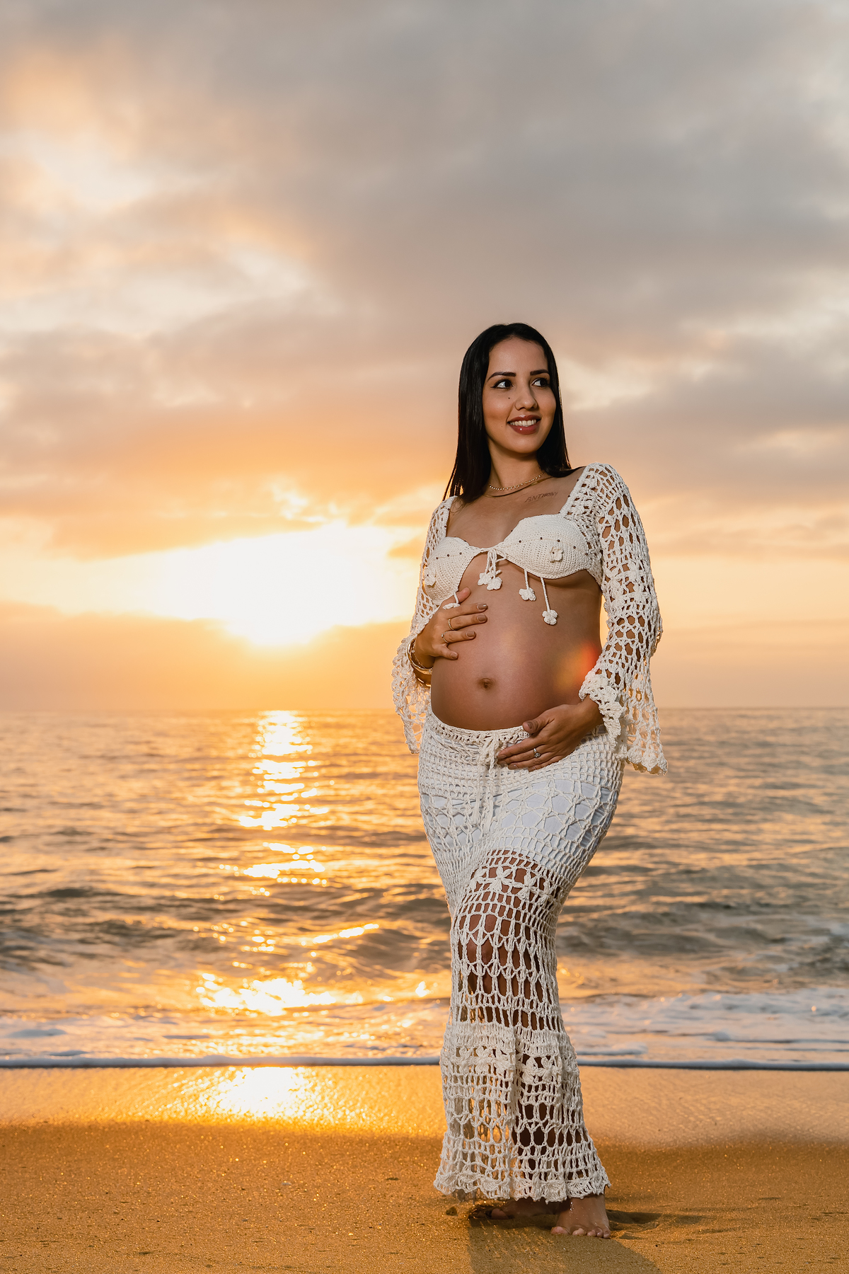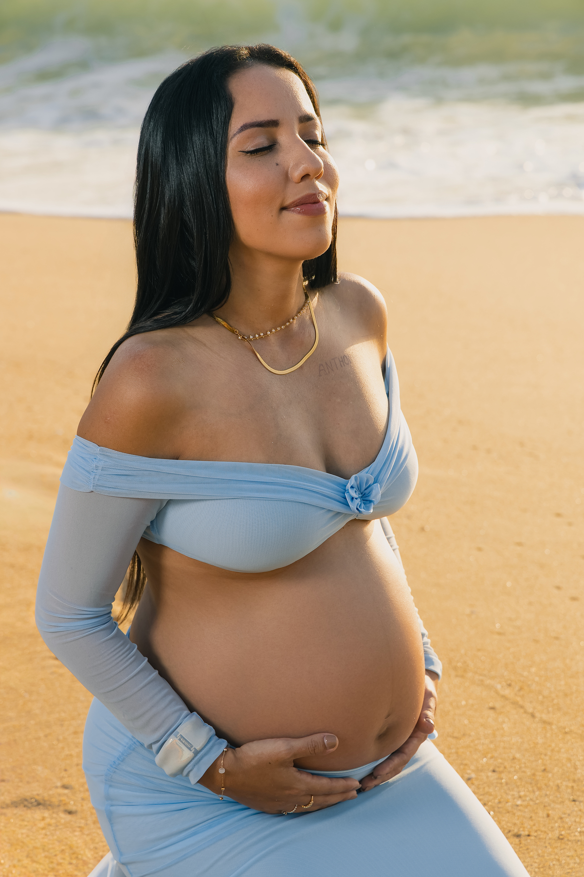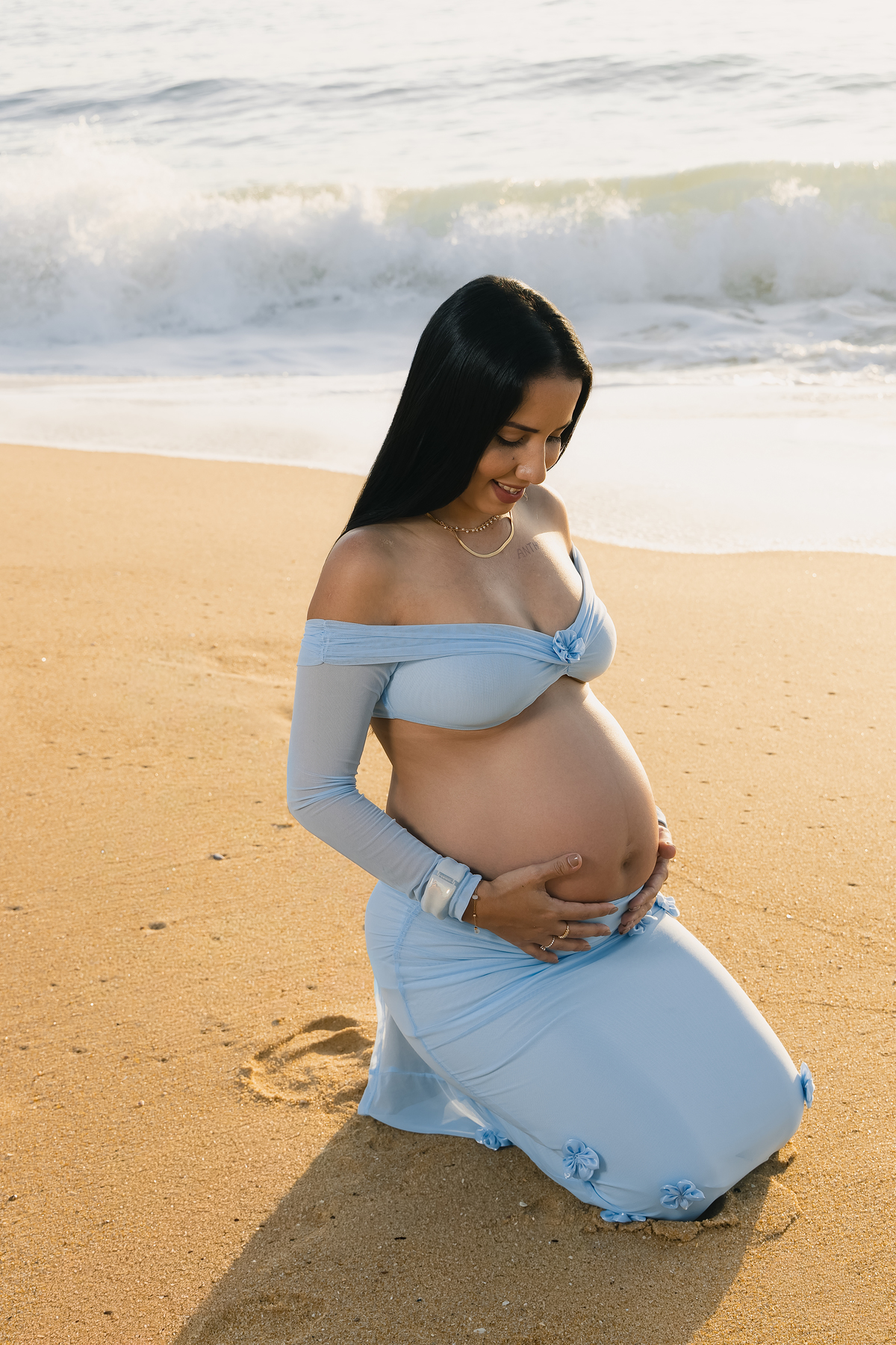 A praia, com sua imensidão azul e a luz dourada do amanhecer, foi o palco ideal para registrar esse amor que transborda. Cada passo na areia carregava significado. Cada abraço revelava cumplicidade. Cada sorriso deixava claro que a chegada de Antonella já transformou tudo ao redor.