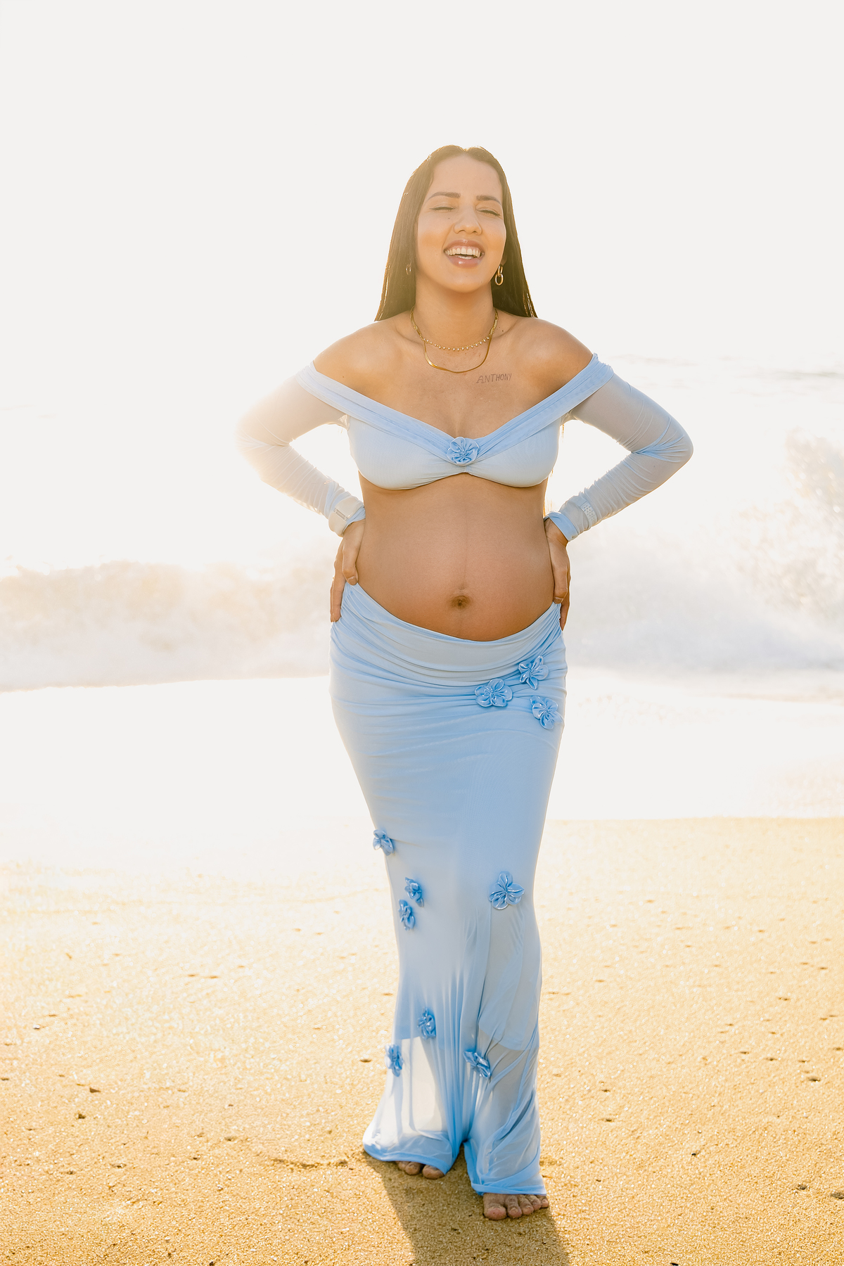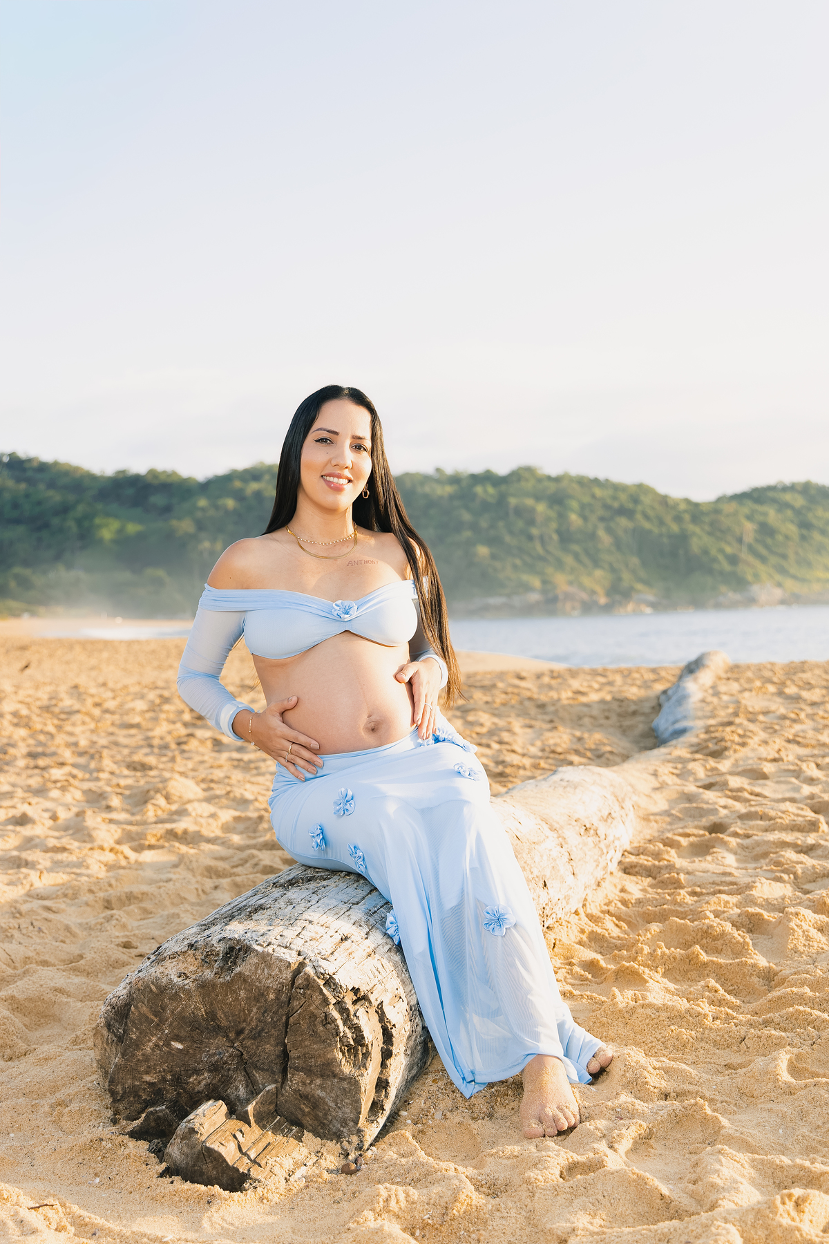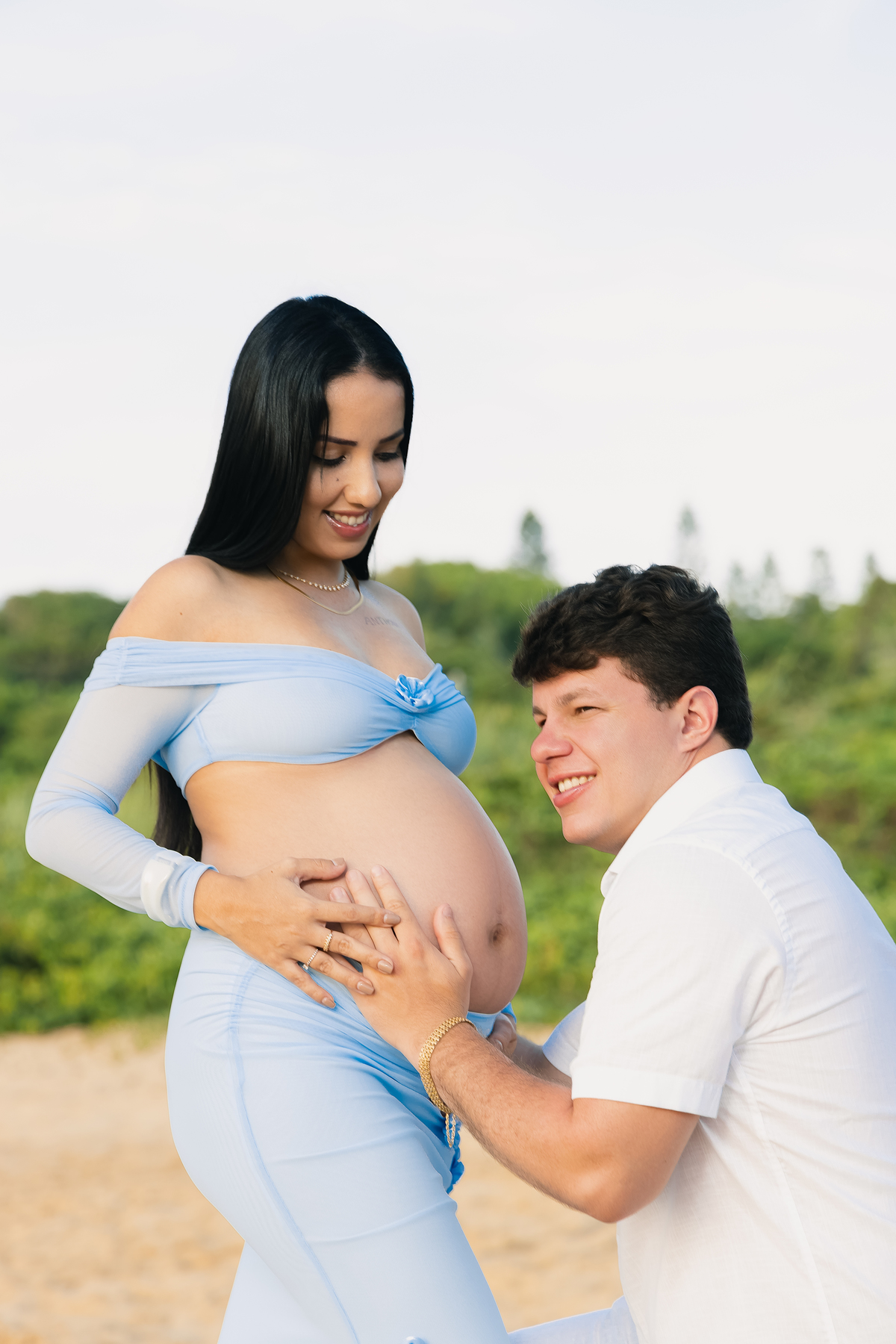Ensaios externos têm uma energia única. O vento leve, o som das ondas e a liberdade do ambiente criam uma atmosfera natural e espontânea — perfeita para capturar sentimentos verdadeiros. E foi exatamente isso que aconteceu: Tamara e Anthony não precisaram “posar”. Eles apenas foram quem são — um casal que se ama profundamente e que agora vive a expectativa do maior presente da vida.